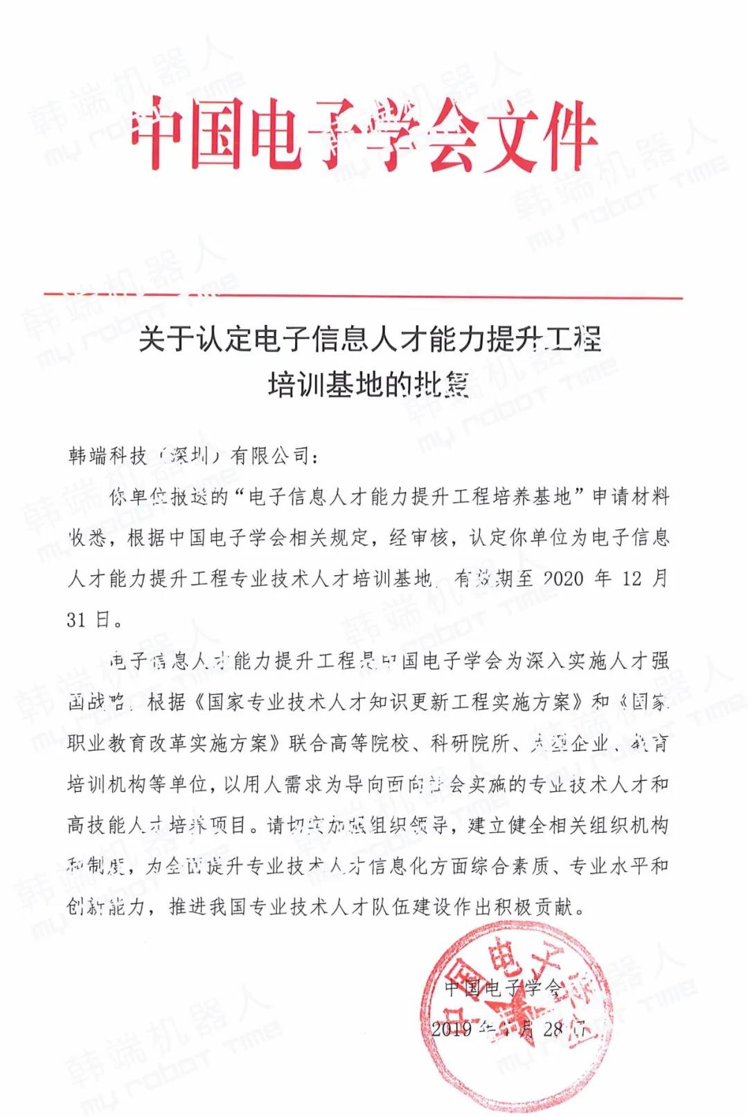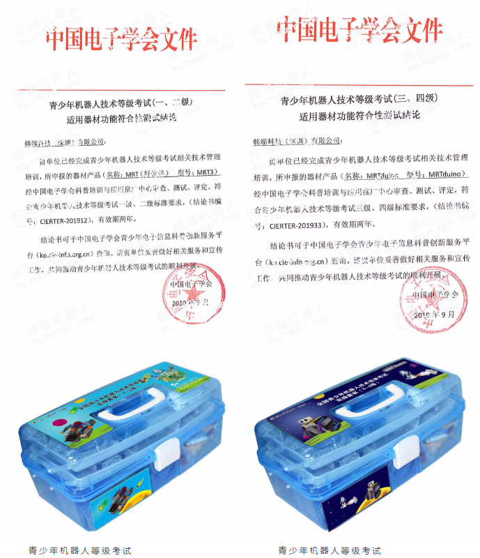 2019年韓端機(jī)器人產(chǎn)品經(jīng)評(píng)審被認(rèn)定為全國(guó)青少年機(jī)器人技術(shù)等級(jí)考試推薦器材,以下為電子學(xué)會(huì)授權(quán)文件以及1-2級(jí)、3-4級(jí)等級(jí)套裝: