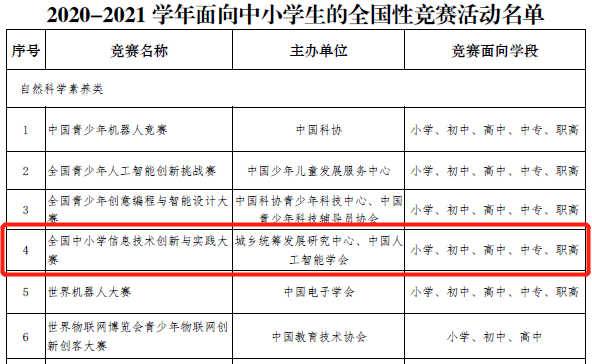 教育部公布的2020-2021學(xué)年面向中小學(xué)生的全國性競(jìng)賽活動(dòng)名單,名單分為“自然科學(xué)素養(yǎng)類”“人文綜合素養(yǎng)類”“藝術(shù)體育類”三類,共有“中國青少年機(jī)器人競(jìng)賽、全國青少年人工智能創(chuàng)新挑戰(zhàn)賽、全國中小學(xué)信息技術(shù)創(chuàng)新與實(shí)踐大賽(NOC)”等35項(xiàng)競(jìng)賽進(jìn)入該名單。