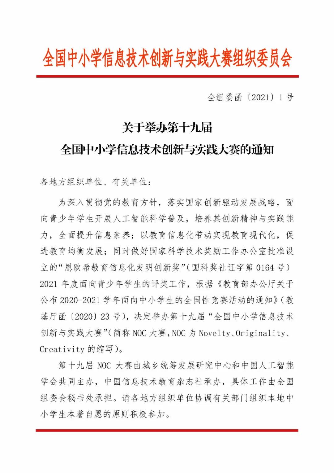 “全國中小學(xué)信息技術(shù)創(chuàng)新與實(shí)踐大賽”是一項(xiàng)運(yùn)用信息技術(shù),培養(yǎng)廣大師生的創(chuàng)新精神和實(shí)踐能力,面向青少年學(xué)生開展人工智能科學(xué)普及、引領(lǐng)科技創(chuàng)新的素質(zhì)教育實(shí)踐平臺(tái),簡(jiǎn)稱NOC大賽(NOC為Novelty, Originality, Creativity的縮寫)。