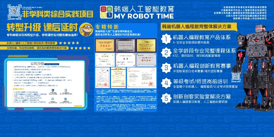 韓端科技作為廣東省專精特新企業,根植科學素質教育賽道十多年,機器人+編程+人工智能+教培體系,已經形成了一整套獨具特色并頗具市場競爭力的青少年機器人編程、人工智能創新教育整體解決方案,目前正在全國范圍內不遺余力地推動與各K12學校合作共建機器人編程與計算思維培養創新實驗室,開展非學科類綜合實踐項目,積極協力各學校落地教育雙減政策、完善課后延時服務體系,這也必將有助于我國青少年機器人編程與計算思維提升工程的推廣普及。