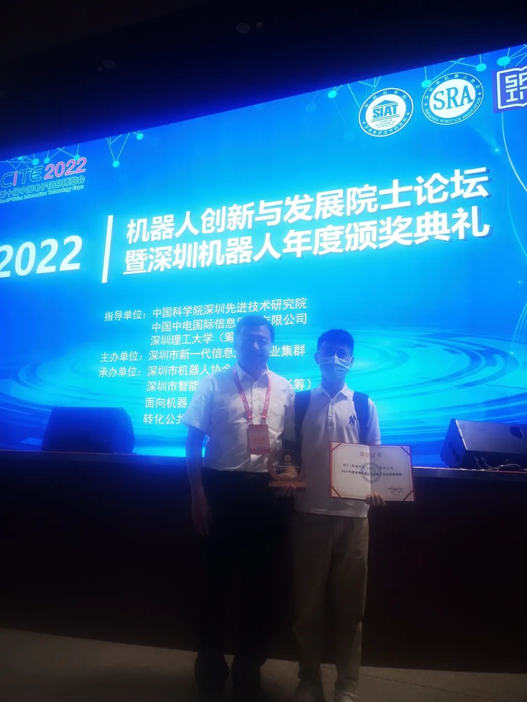 (深圳市機器人協會秘書長畢亞雷先生與公司受獎代表合影留念)