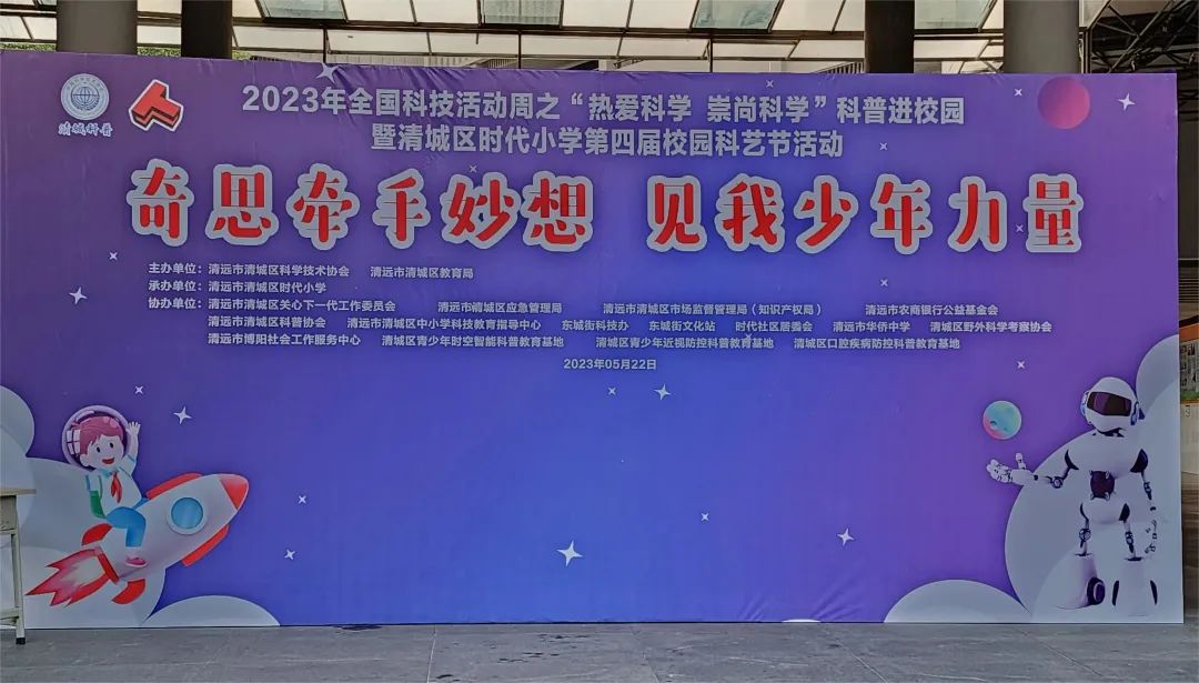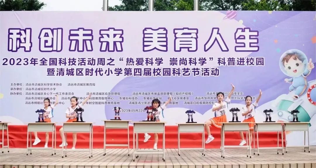 清遠市清城區時代小學隆重舉行科創未來,美育人生第四屆科技藝術節,本次科藝節活動得到了清城區科協、清遠市和清城區教育局、廣州美術學院、清遠職業技術學院、中國工程師社團聯盟(深圳市工程師聯合會)、深圳韓端機器人公司、廣州市云蝶科技有限公司、廣州市泰歌會、清遠市水文局、清遠市氣象局等單位的大力支持。