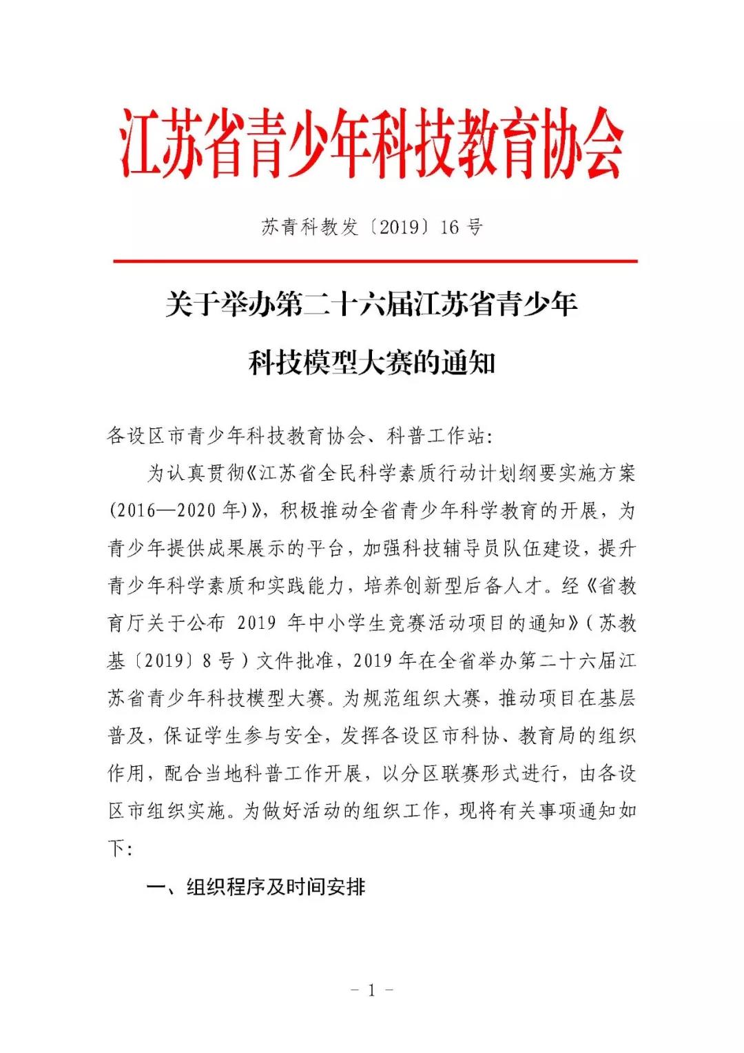 為認真貫徹《江蘇省全民科學素質行動計劃綱要實施方案(2016—2020年)》,積極推動全省青少年科學教育的開展,為青少年提供成果展示的平臺,加強科技輔導員隊伍建設,提升青少年科學素質和實踐能力,培養創新型后備人才。經《省教育廳關于公布 2019 年中小學生競賽活動項目的通知》(蘇教基〔2019〕8號)文件批準,2019年在江蘇省全省舉辦第二十六屆江蘇省青少年科技模型大賽。