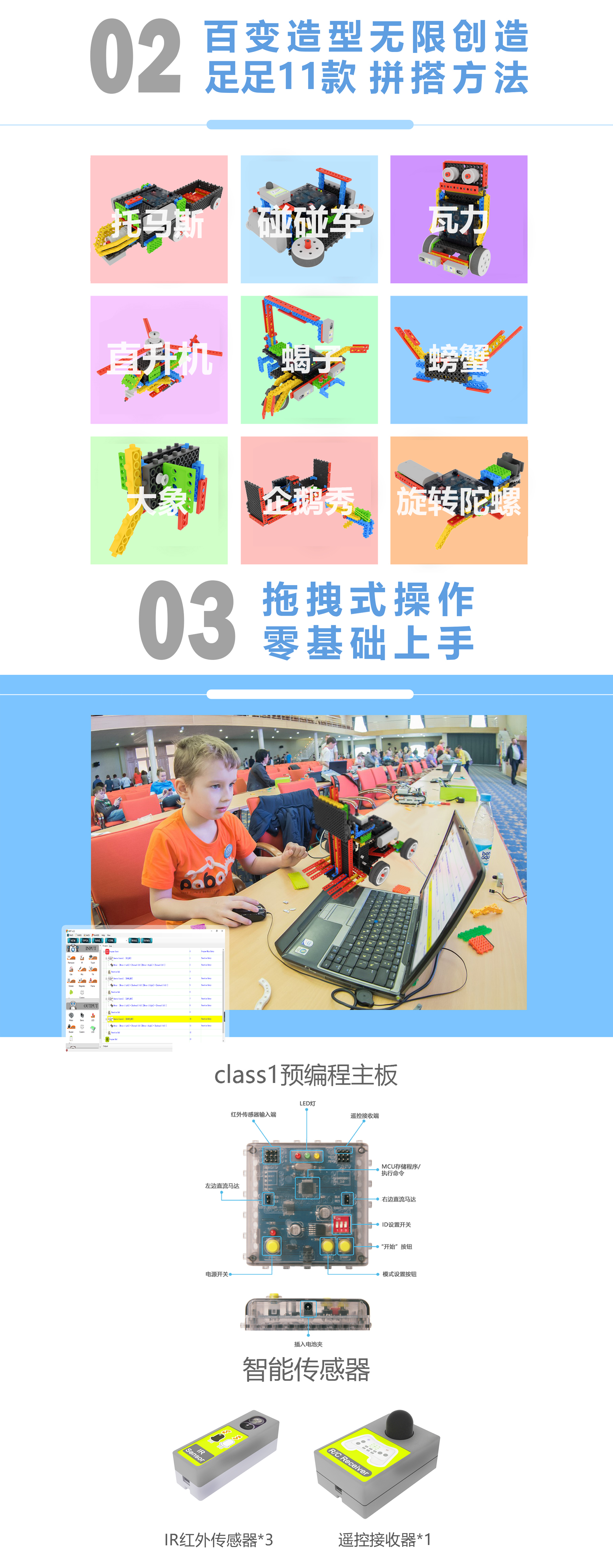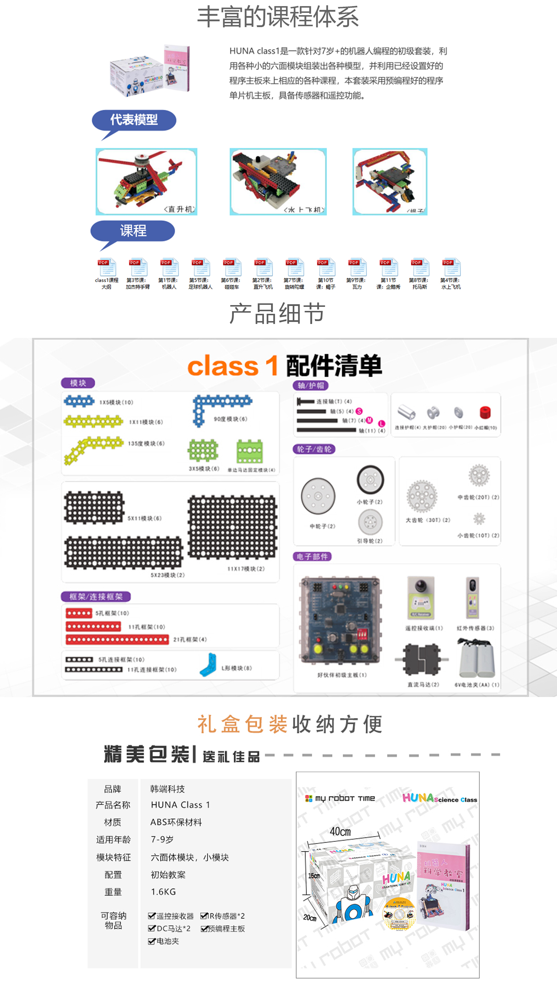 產品參數 產品名稱:好伙伴初級(HUNA class1) 外觀顏色:多彩積木 產品材料:ABS環保材料 模塊特性:六面體模塊,小模塊 電 機:DC馬達*2 主 板:預編程主板,6種模式選擇,2個電機接口,2個輸入 口,3個輸出口 傳 感 器:遙控接收端1個,IR紅外傳感器*3 模型數量:12個(8個動態和4個靜態) 額定電壓:6V (5號電池4節) 功 能:DIY 教學,主板為單片機控制模式,程序已設置完畢,可設置模式,帶遙控器控制。 適用年齡:7-9歲 重 量:1.6KG 配 置:初始教案 包裝尺寸:寬260*厚210*高170mm 彩盒包裝