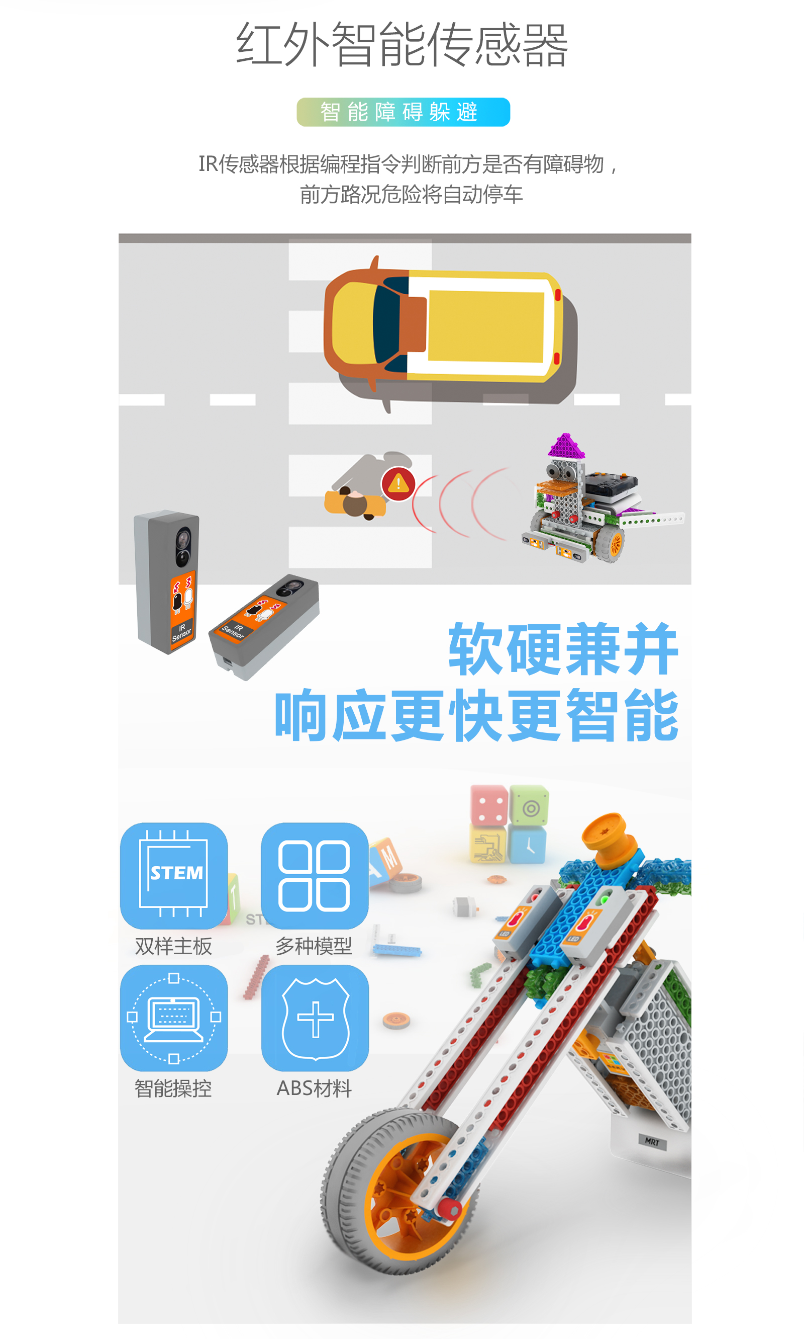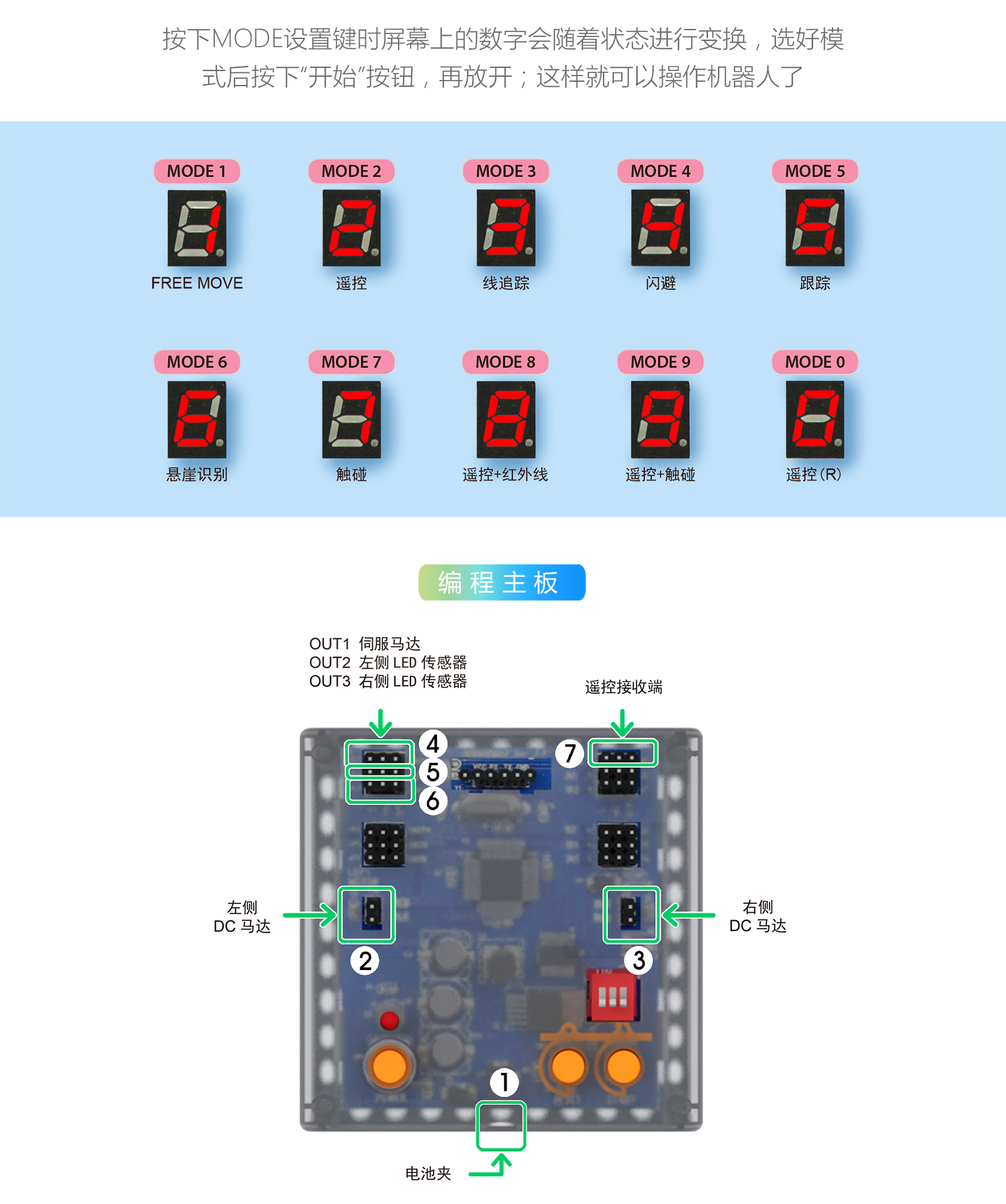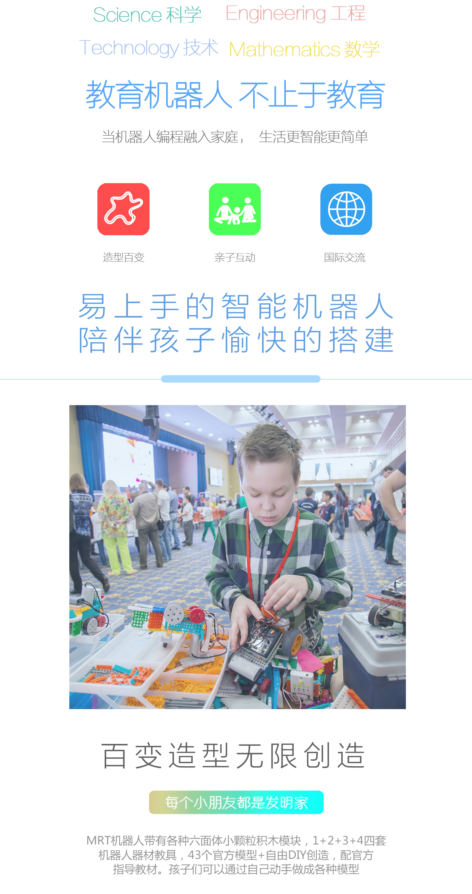 產品參數 產品名稱:MRT3-1 外觀顏色:多彩積木 產品材料:ABS環保材料 模塊特性:六面體模塊,小模塊 電 機:DC馬達*2 主 板:預編程主板,帶LED數碼管顯示,10種模式選擇,2個電機接口,3個輸入 口,3個輸出口 傳 感 器:遙控接收器*1 模型數量:15個(10個動態+5個靜態) 額定電壓:6V (5號電池4節) 功 能:DIY 教學,主板為單片機控制模式,程序已設置完畢,可設置模式,帶遙控器控制。 適用年齡:7-9歲 重 量:1.18KG 配 置:初始教案(英文) 包裝尺寸:寬220*厚280*高90mm 彩盒包裝